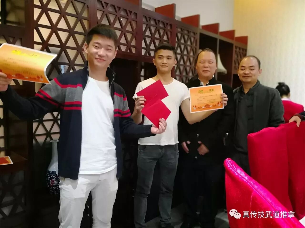 武道推拿在在廣大客戶的支持下經歷了多彩的2017年,也迎來了充滿生機的2018年。在元旦佳節(jié)來臨之際,武道推拿師門也迎來了一年一度的武道推拿師門大會暨收徒儀式! 一共舉辦了四大項活動: 一、全體徒弟學習成長心得及太極拳比賽, 二、謝師宴,弘揚傳統精神,不忘師恩, 三、拜師收徒儀式, 四、年會聚餐; 上午的太極拳比賽即緊張又精彩,每位參賽者都憋足了勁發(fā)揮自己最好的水平,既是對自己一年來學習武道推拿的總結,也是向師父做一次精彩的匯報! 比賽完畢已到中午時分,徒弟們?yōu)榱吮磉_對師父的感恩與答謝,特設謝師午宴。席間,徒弟們各自說出了自己的肺腑心聲,酒水雖然淡薄,但情意深厚,感恩師父傳授精湛的技藝,感謝師父的默默教誨與殷殷關愛。